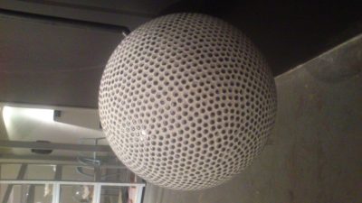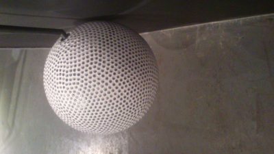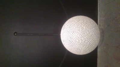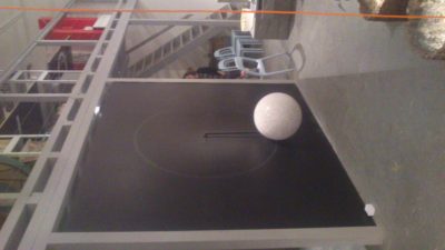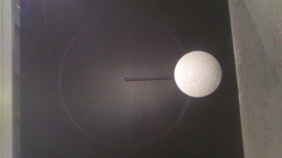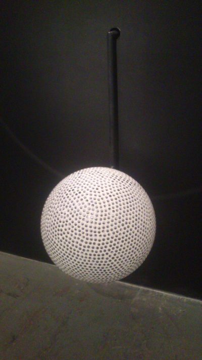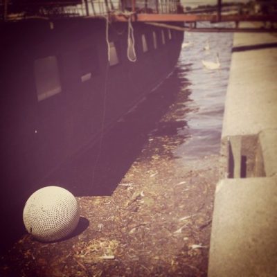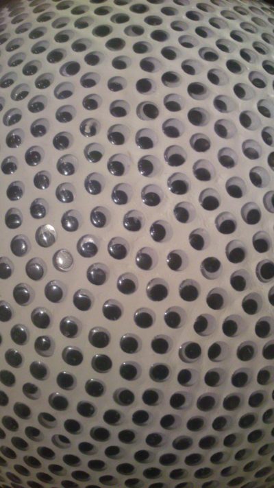 The ICU kinetic object was more of a joke to counterbalance the very serious looking project, which was inspired by the same topic – gift (called _). The original installation consisted of a sphere with the diameter of 1 meter, which was attached to the end of a curved shaft, so that it could rotate around its axis. The cranked shaft went through a plasterboard partition, behind which the engine was stored. The sphere itself was covered by about 3,500 googly eyes, partially embedded in a layer of putty. When turned on, the sphere started moving in a jerking motion along the black bar, making a lot of noise and drawing a circle about 3 meters in diameter. When in motion, the pupils followed a triple rotary axis. They rotated in a big circle drawn by the shaft, made another circle as the sphere rotated around its axis and finally there was a third rotary movement drawn by the pupils of the eyes. The ball was then used at the exhibition Glass to Face at the (A)Void Floating Gallery, where it functioned as a sort of a watchful buoy floating on a layer of waste drifting around the paddle wheel of the old steamer. The ICU thus became an imaginary observer of the world above and below the water surface. In the end, the ball was stolen and according to some rather unreliable sources, it has become a sort of a votive object for a techno sound system unfortunately unknown to me.
