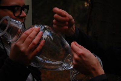 The OD_RAZ_DVA project was a continuation of my video experiments, created basically without my intervention. I only prepared ideal conditions for the given situation and then recorded its course. This project in particular was created in connection to a series of smaller projects in public space called U.mě.les., which have unfortunately not been filmed. Still, these projects were presented as the installation called Too Many Holes in the Wall at the exhibition OD_RAZ_DVA in multifunctional space called Grid with Sitespecific. The OD_RAZ_DVA project was based on a source of light, a backlit object (in this case a semi-finished Moser vase), a glass focusing screen, a camera and last but not least, we cannot forget the role of the tree on top of the hill … It may seem that the tree on the hill is very different from the rest of the objects but it was the tree that served as a source of naturalness that I try to not interfere with. The listed items were hung on the branches of the tree in their respective order and as it began moving in the wind, the entire installation was set into motion. The created video is thus a record not only of the optical phenomena that occur when light passes through a vase but also of the place and situation, in which the video was made.