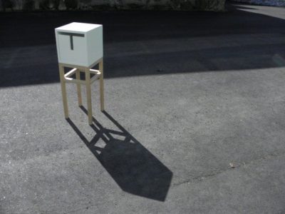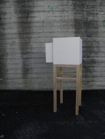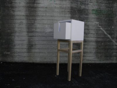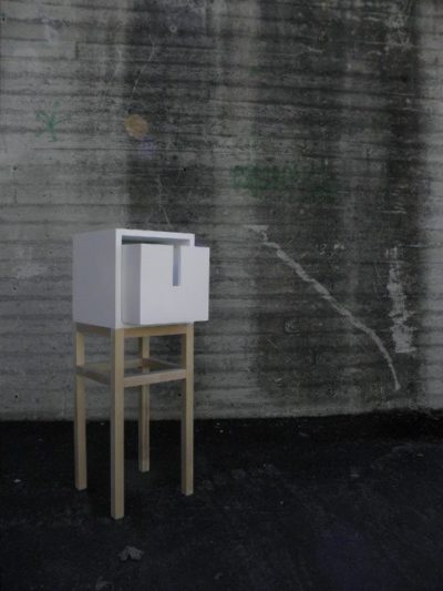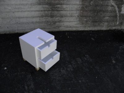 The design of the cabinets Tied was created during my study stay at the product design studio at the in Finland. It is a simple geometric design. The handles for opening the drawer are shaped as tied neckties and clerical collars – something that gave name to the cabinets and also ensures the strict and clean appearance I wanted to achieve.