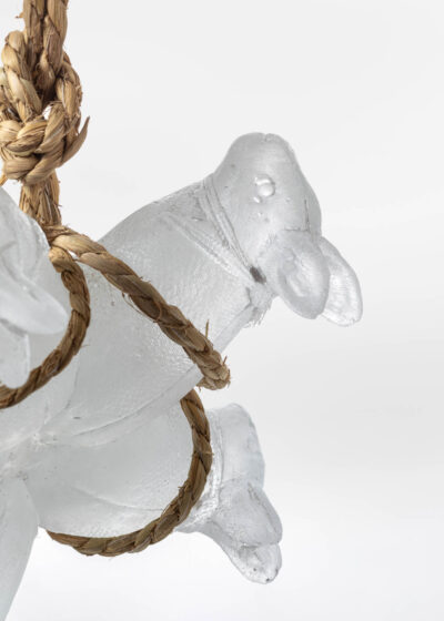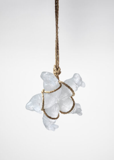 The series consists of several smaller units with their own sub-themes. In this case, it focuses on a subgroup of objects titled Charms of No One. A pair of hanging objects complemented by a rice rope loosely references the popularization of Shinto rituals. Tourists often practice specific prayer procedures without knowing whether they are praying for fertility or for the absence of a traffic accident in the coming year. The objects themselves thus function as fictional religious artifacts that could belong to “tourist temples” and serve as recipients of these “worthless” prayers.