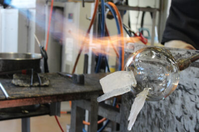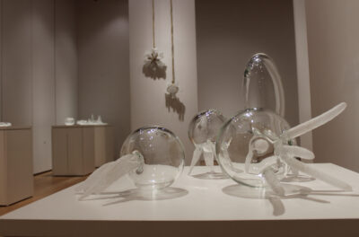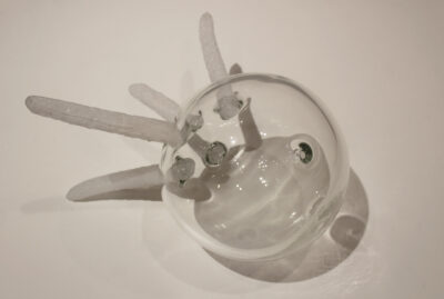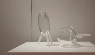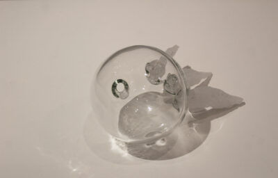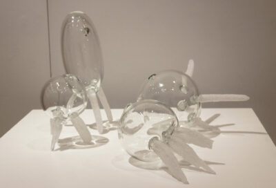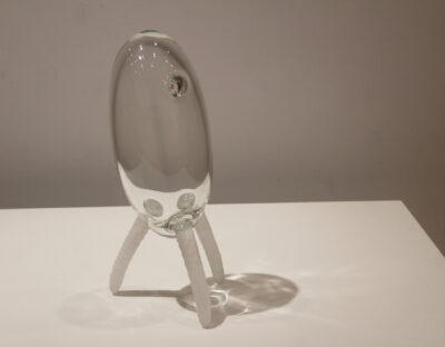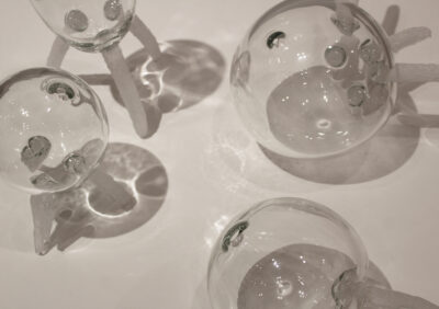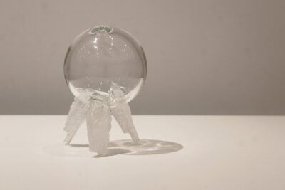 The series is made of individual smaller units with their own sub-themes, in this case it is a subgroup of objects that gave the name to the whole series, i.e. Far from Nowhere. This is a group of objects using a combination of kiln casting technology and hotshop processing of glass. Cast objects in the shape of cucumbers and a piece of wood found on the beach were reheated and combined with bubbles blown at the hotshop. The artist used a similar approach in projects planned as part of previous residencies abroad in connection with the same conceptual theme (Montana, USA, 2019 and Frauenau, Germany, 2021).
